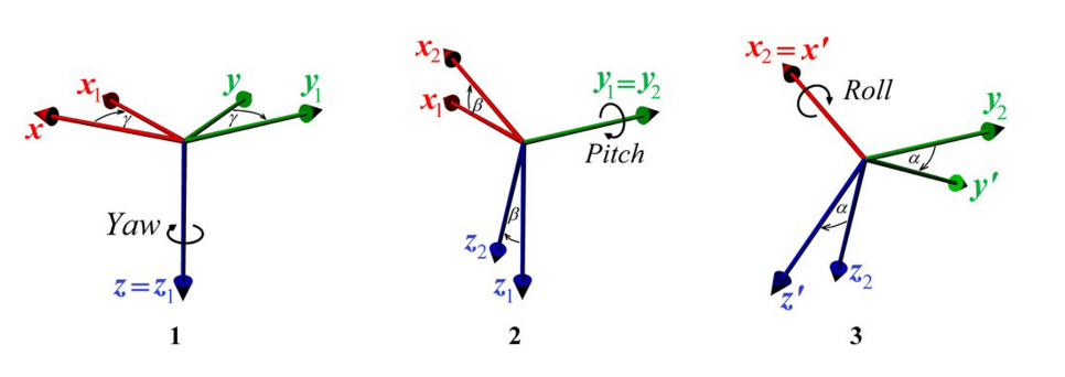 - This means: rotate around x, then y, then z — in that order. The order matters a lot because matrix multiplication is not commutative (i.e., AB≠BA).