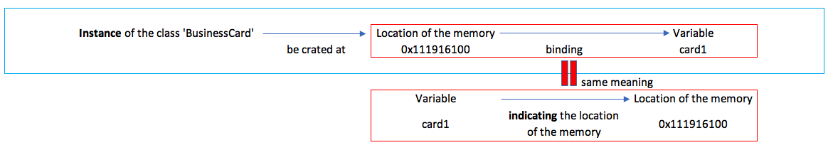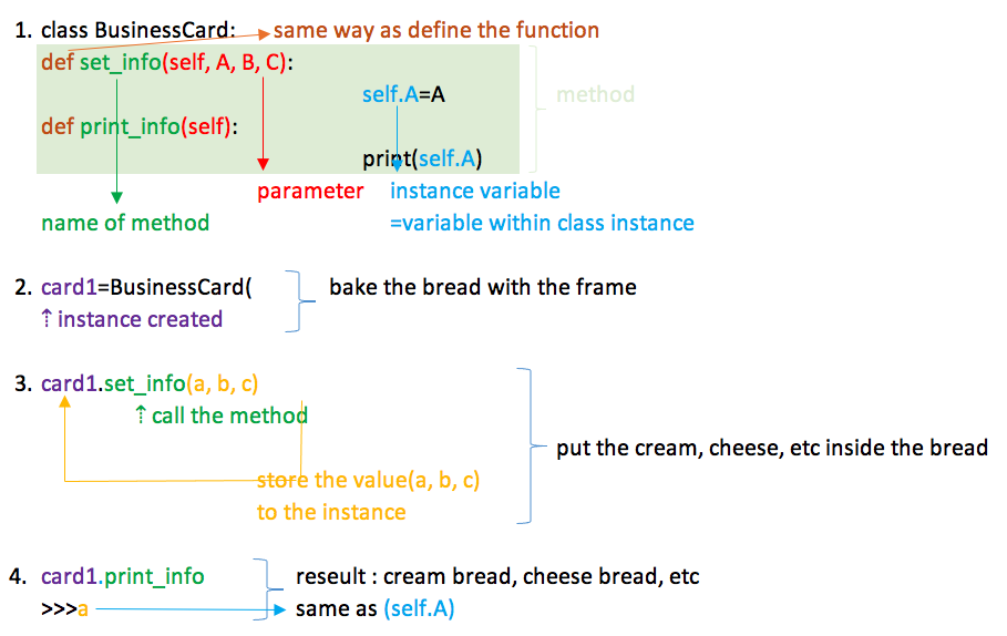 | 2. 1. initialized class<--3 parameters(name, email, addr)<--constructor 〉〉 instance variable (BusinessCard) ⇡receiving ⇡from ⇡storing instance()<--instance method created⇡ (card1) ⇡calling-->instance variable 3. 4. ⇡print 5. |