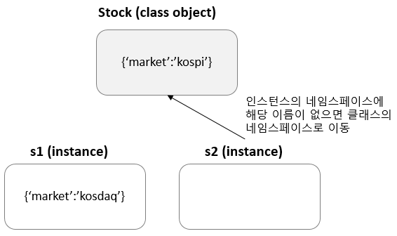 When there is none of variable nor method in the namespace of the instance, it refers class namespace.