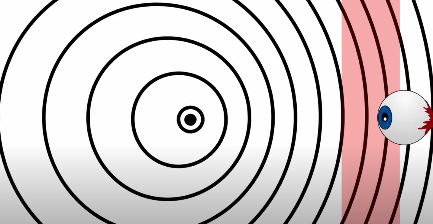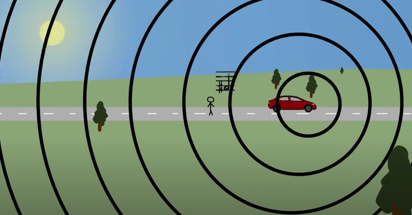 and then when the vehicle passes you and is moving away from you, the sound waves spread out, and so you hear them at a lower frequency – a lower pitch.