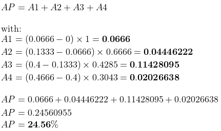 We could visually have the interpolated precision points by looking at the recalls starting from the highest (0.4666) to 0 (looking at the plot from right to left) and, as we decrease the recall, we collect the precision values that are the highest.