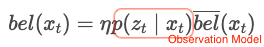 It is a step of predicting the current position of the robot using input data () and correcting the predicted position of the robot from the sensor data () obtained at that position. is refferred to as an Observation Model, and means the probability that the sensor data () obtained from the currently predicted state ().