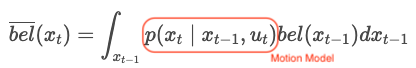 It is a process of estimating the probability of the current robot state using control input data () and robot state of previous step (). is call a Motion Model because it estimates the robot's movement by input () and calculates the probability of the current state.- Motion Model
