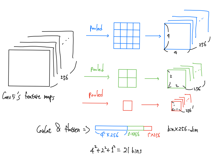 To overcome this issue-the fixed size constraint of a CNN network, it replaced the last pooling layer (the one just before the FC layer) with a Spatial Pyramid Pooling(SPP) layer. The SPP approach is inspired by the Bag of Words approach.