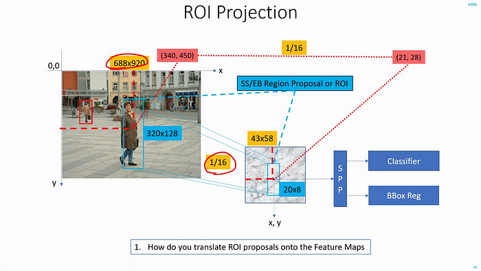 In this way, we can map any object from the input image to the output feature map. The object’s coordinates are also projected to the feature map, and only that region are then sent to the SPP layer for feature extraction and then to the FC layer.