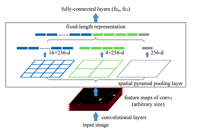 If you make the pooling window and stride proportional to the input image, you can always get a fixed-sized output. Moreover, the SPP layers do not just apply one pooling operation, it applies a couple of different output sized pooling operations (that’s where then same comes from — Spatial Pyramid Pooling) and combines the results before sending them to the next layer.