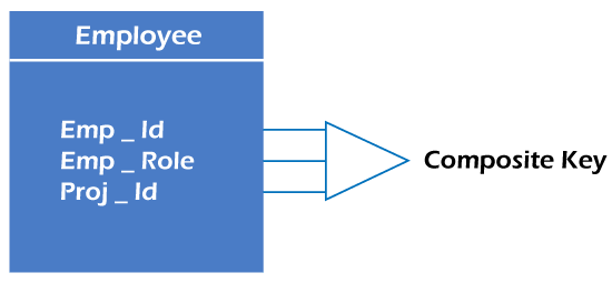 For example, in employee relations, we assume that an employee may be assigned multiple roles, and an employee may work on multiple projects simultaneously. So the primary key will be composed of all three attributes, namely Emp_ID, Emp_role, and Proj_ID in combination. So these attributes act as a composite key since the primary key comprises more than one attribute.