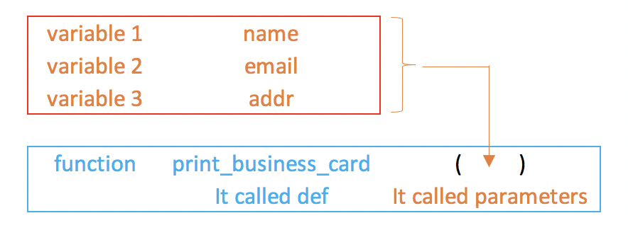 name='aaa' email='bbb@gmail.com' addr='seoul' def print_business_card(name,email,addr): print('name:%s'%name) print('email:%s'%email) print('address:%s'%addr) print_business_card(name,email,addr) >>> name:aaa email:bbb@gmail.com address:seoul parameter A parameter is the variable listed inside the parentheses in the function definition. argument An argument is the value that is sent to the funct..