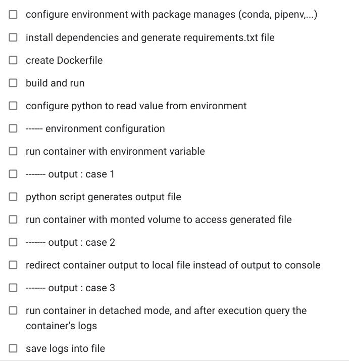 1. Configure environement with package manages - Create conda environment $ conda create -n practice_pandas - Activate conda environment $ conda activate practice_pandas (practice_pandas) $ 2. Install dependencies and generate requirements.txt file - Install libraries $ pip install decouple - Generate requirements.txt file pandas==1.2.4 elasticsearch==7.15.0 python-decouple==3.5 3. Create Docker..